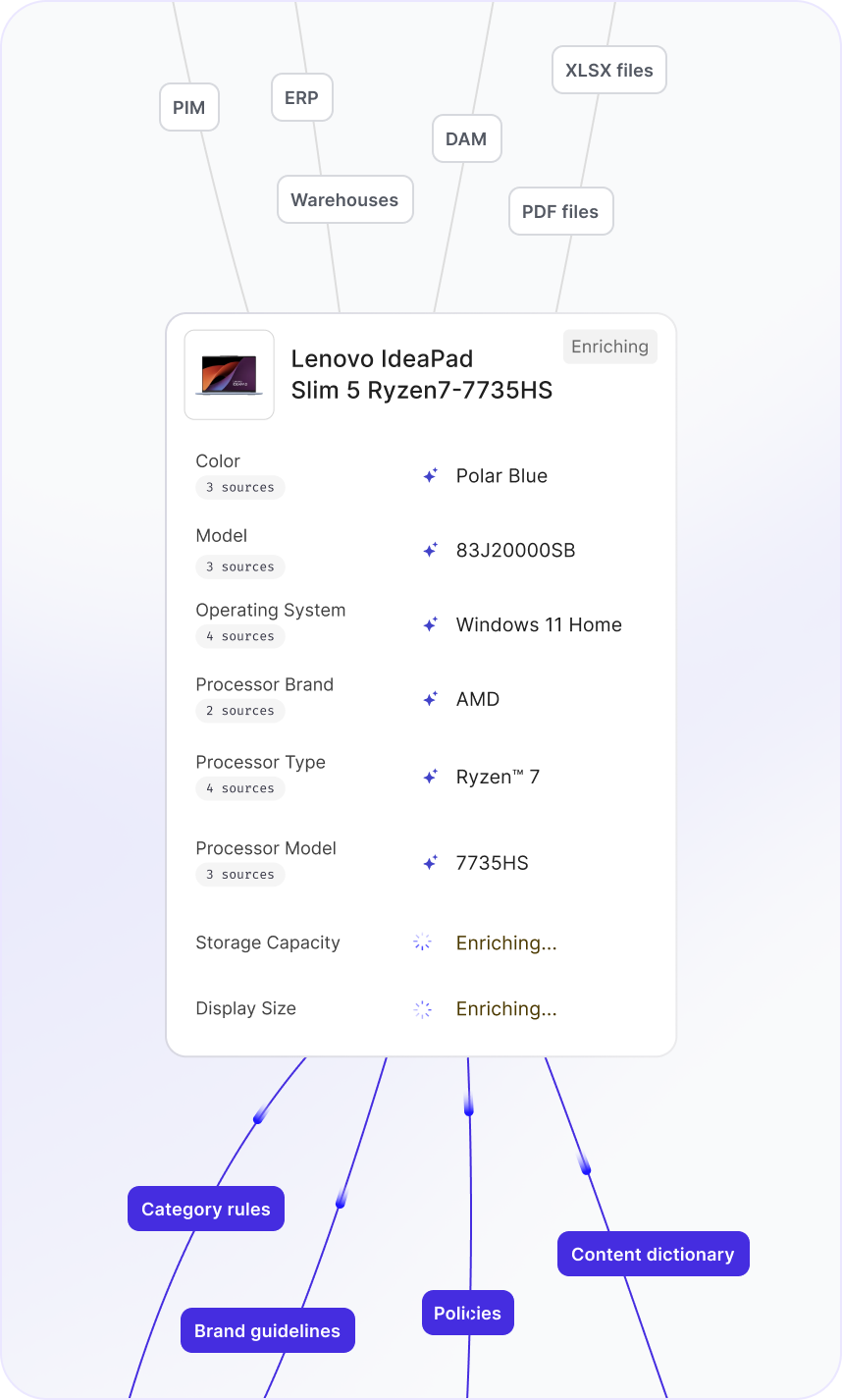 Ingest from ERPs, PIMs, supplier feeds, PDFs, and images. Any system. Any format. One profile.