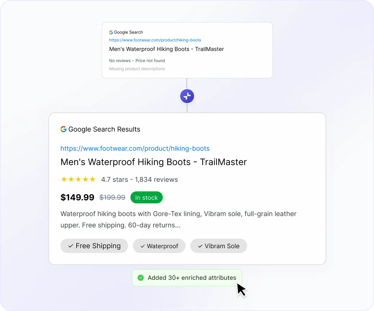 Traditional SEO tools optimize pages. Trustana optimizes the product data pages are built from. Richer attributes, better titles, structured markup — generated at scale.