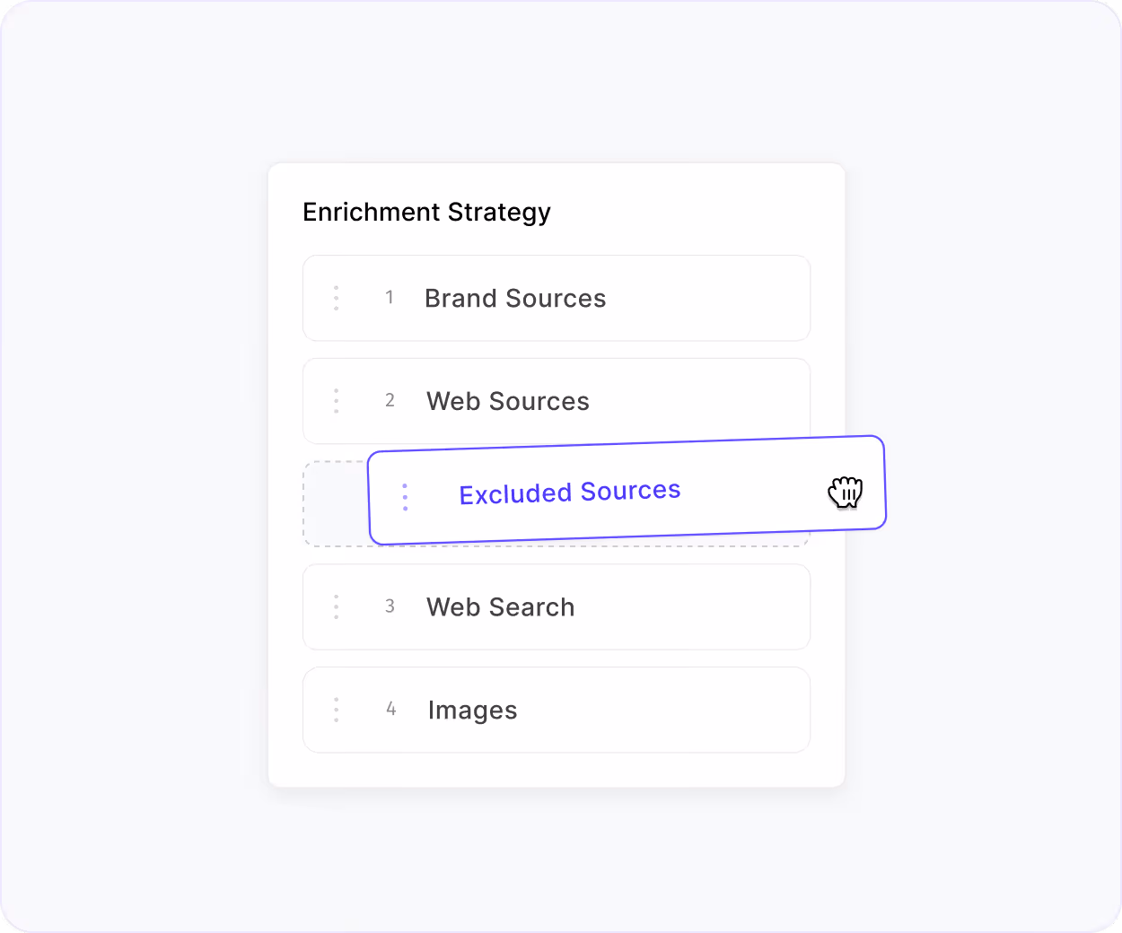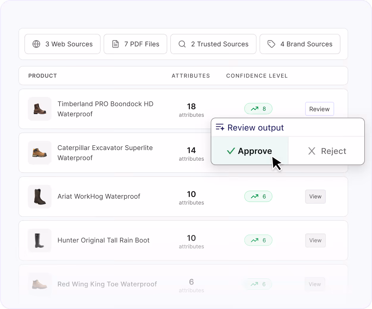 Run waterfall enrichments across your source hierarchy, moving through supplier data, brand content, PDFs, images, and public sources in the order you define.